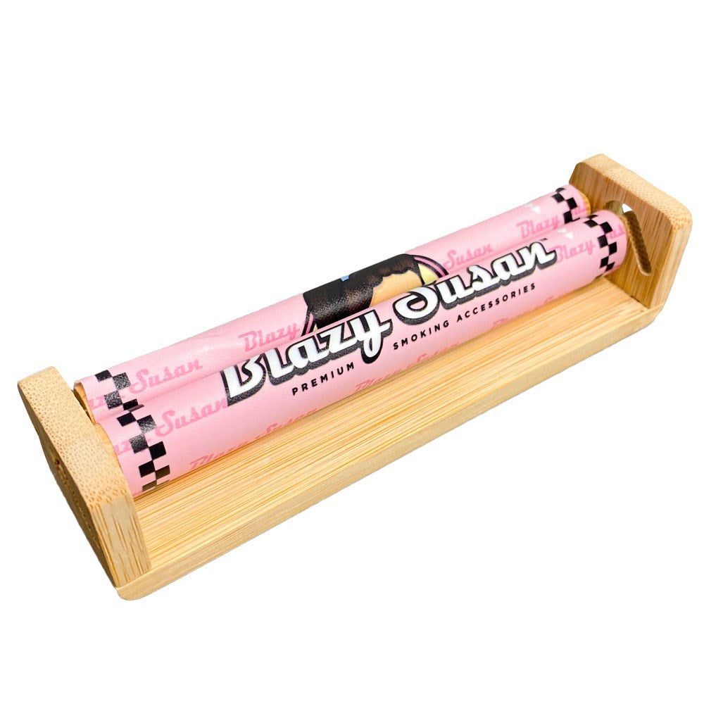 12/BOX \n \nHaving trouble rolling by hand? Don’t struggle with your rolls any longer! Blazy Susan’s Bamboo Rolling Machine helps you pack and roll the perfect j every time. \n \nSimply place your paper or wrap onto the rolling mat, load your material (not too full!), close the sliding dowl and roll your paper through the machine until you’re left with the gum line sticking out. Apply moisture to your gum line and finish rolling through to seal everything up. Open the sliding dowel and toke away! \n