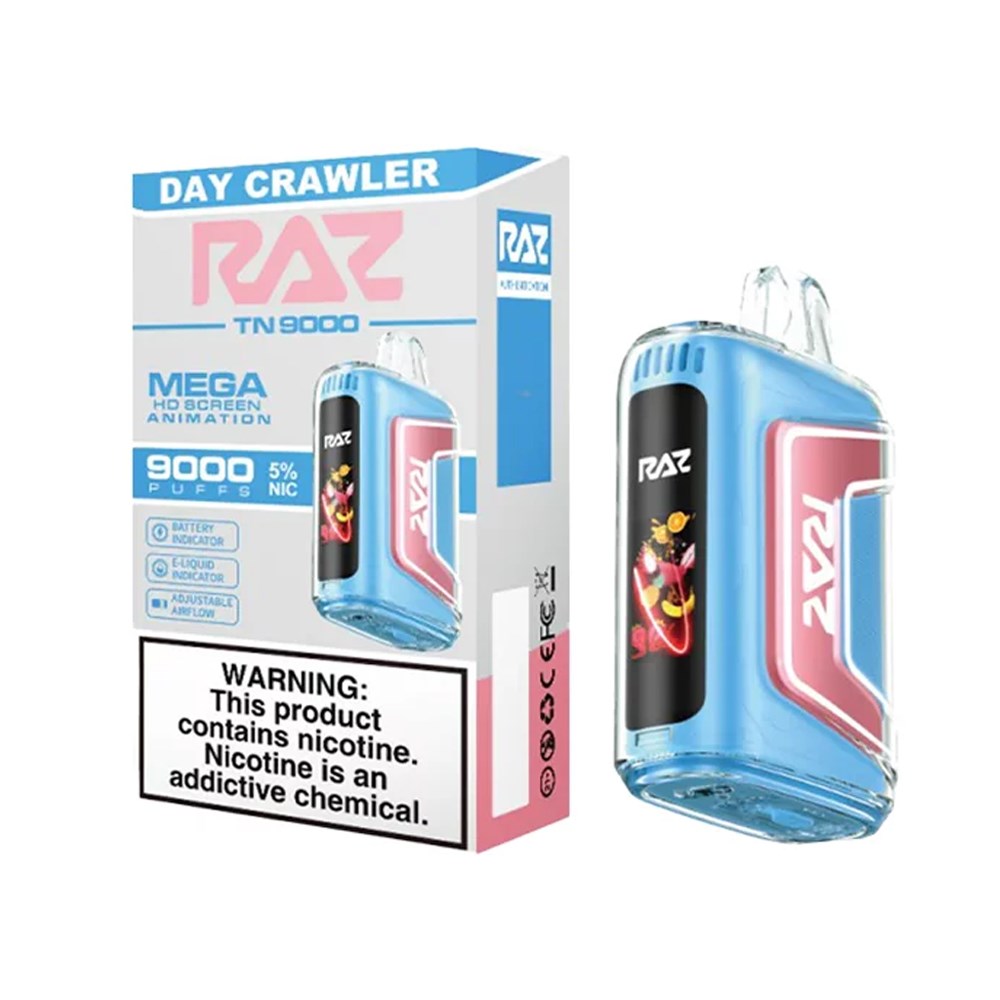 5/BOX \n \nThe RAZ TN9000 Disposable is a vaping powerhouse that delivers a whopping 9000 puffs of pure satisfaction. With a substantial 12mL e-liquid capacity and a nicotine strength of 50mg, this disposable device is designed to provide a flavorful and convenient vaping experience that lasts. \n \nFlavor: \n \nDAY CRAWLER:  Combines zesty citrus notes with a smooth, consistent hit. \n \nFeatures: \n